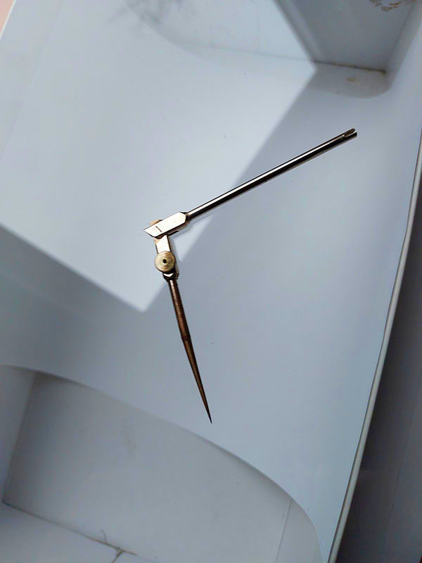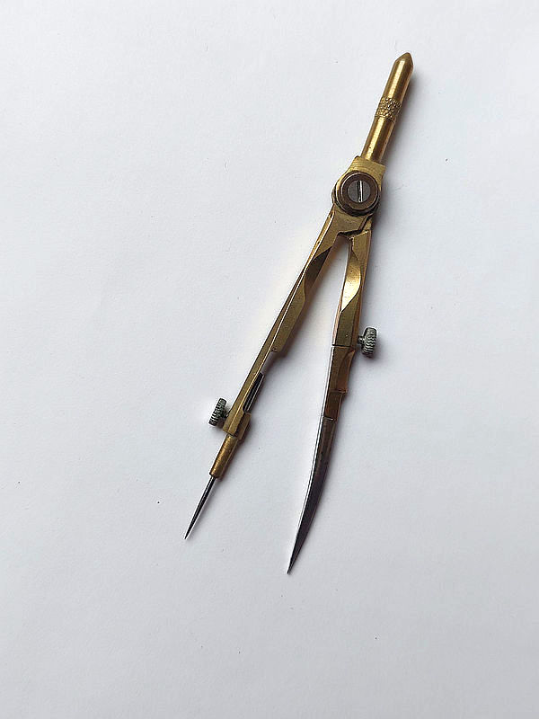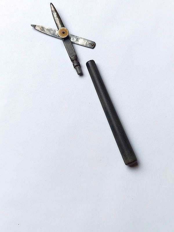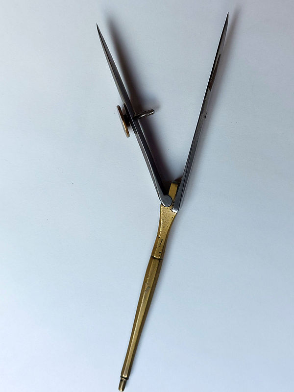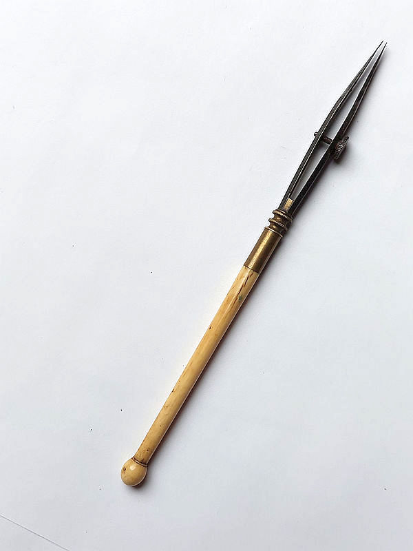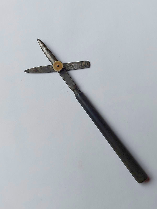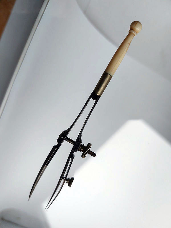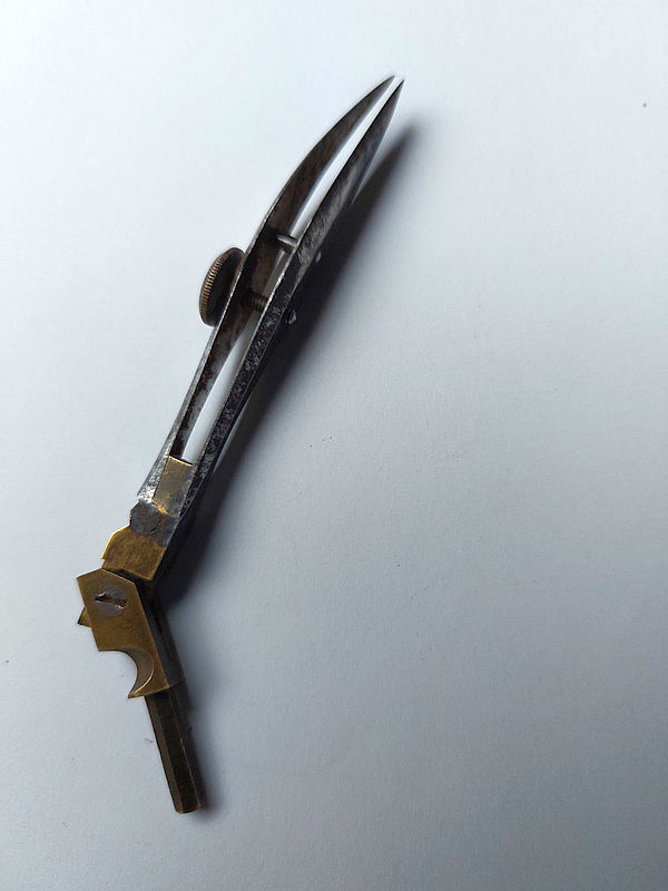 Swiss made? Cirkel passer met inktdeel rechts. vgl: https://www.si.edu/object/bow-compass-pen-point:nmah_892943 Draaipasser met inktstuk (gebruikt) Model ivoren handvat (koud) uit ca. 1909-1910 Tussenstuk: roestvrij metaal. Onderste deel: gematteerd zwart ijzer. De passer is eeerder gebruikt. Datering ca . 1900 (1897-1907) Hoogte: 11,5 cm. |