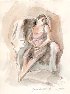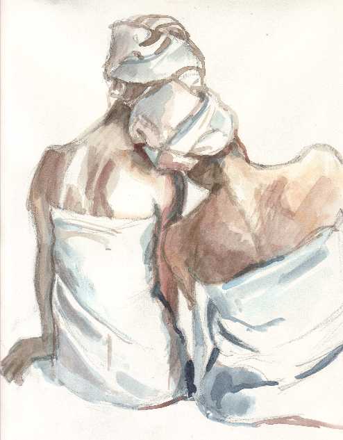 Hollander Neem bij belangstelling voor de getoonde aquarellen contact op per email ![]() De getoonde werken zijn te koop, uitgezonderd werk dat zich in particuliere collecties bevindt. Klik op afbeeldingen voor groter formaat ![]() Twee vrouwen in badhuis. 17 Juni 2009. Aquarel (digitaal links en rechts gedeeltelijk afgesneden). Volledige bladmaat 25 x 32,5 cm. Gesigneerd. (particuliere collectie) |