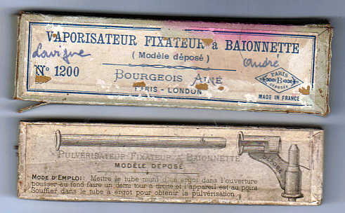 In oude catalogi van o.a. Bourgois Ainé kom je fixeerspuitjes (vaporisateurs)  in diverse soorten tegen.  Om het opdrogen van fixatief in het lange buisje van een spuitje te voorkomen, kan een iets langer glad stuk koperdraad goede diensten bewijzen.  Schuif, na het fixeren en uitslaan van het langste buisje, een deel van het stuk stroomdraad daarin tot het onderaan het buisje er weer uitkomt.  Buig de rest van het draad bovenaan om.  Zo zit er, na verwijdering van het stuk draad, de volgende keer geen aangekoekte fixatief in het buisje en kan de fixeervloeistof zich probleemloos door het lange buisje verplaatsen.  In één van de doosjes, dat op een brocantemarkt te koop was, had men een paar spelden in de kartonnen wand geprikt om dit effect ook te bereiken.